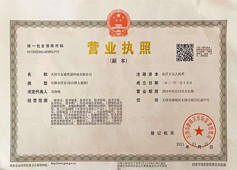 天津市友誠(chéng)管道科技有限公司是專注從事管道以及管道防腐業(yè)務(wù)的大型公司,公司注冊(cè)資金5000萬元,位于中國(guó)管道生產(chǎn)基地-天津靜海大邱莊工業(yè)區(qū),近靠京滬高速公路、津石高速公路、津滄高速公路,距高鐵天津南站35公里,天津國(guó)際機(jī)場(chǎng)60公里,為客戶來訪及業(yè)務(wù)發(fā)展提供了便利的交通條件。